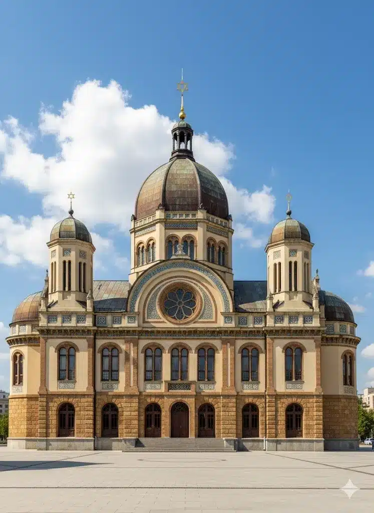 Максиміліан Шльосс запропонував у 1894 році грандіозний проєкт синагоги поступовців з п’ятьма вежами та масивними цибулястими куполами. Центральна вежа мала завершуватися великою зіркою Давида, а візуально будівля повторювала стиль головної синагоги Берліна. Проте кошторис виявився непосильним для громади, тож ідею скоротили до більш скромної версії – синагоги Темпль.