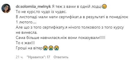 Варто зазначити, Лілія Капріян своє обурення винесла назагал в Інстаграмі. Як виявилось, незадоволена курсом від блогерки не тільки вона. Є й дівчата, які брали кредит з надією на якісне навчання, натомість отримали тільки обіцянки.