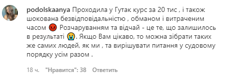 “Коли ми колективно почали вимагати повернення коштів, нас ігнорували. Аж ось подзвонила Маряна Гутак спитатись, що сталось. Розмовляючи з нею, я не відчула, що їй якось не приємно від цієї ситуації, вона виправдовувалась весь час, замість того, щоб визнати, що всі ми люді й помиляємось. Запропонувала пройти ще одні курси, цього разу – безкоштовні. Але ні, дякую. Я не можу погодитися на ще одні, знаючи якої вони якості”,- поділилась дівчина.