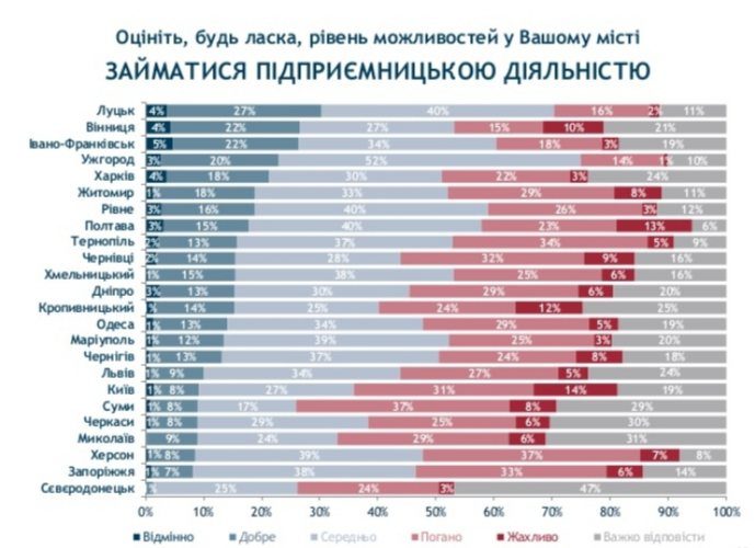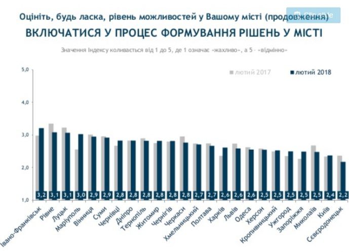 Серед опитаних майже 30% відзначили на “добре” чи на “відмінно” власну можливість включатися у процес формування рішень в місті. Це – найкращий показник серед всіх обласних центрів України.
