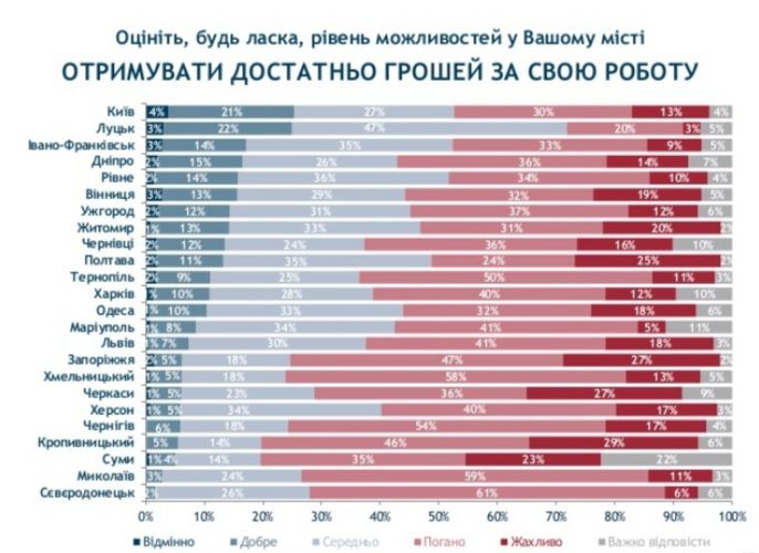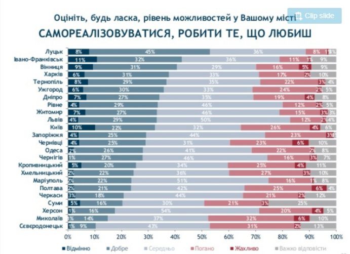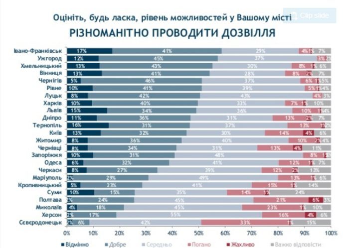 Перше місце Івано-Франківськ посів і за оцінкою різноманітності проведення дозвілля (58% опитаних). Друге місце – за рівнем можливостей до самореалізації (43% задоволених). Третє місце столиця Прикарпаття обійняла за можливостями щодо підприємницької діяльності та гідної оплати праці за свою роботу.