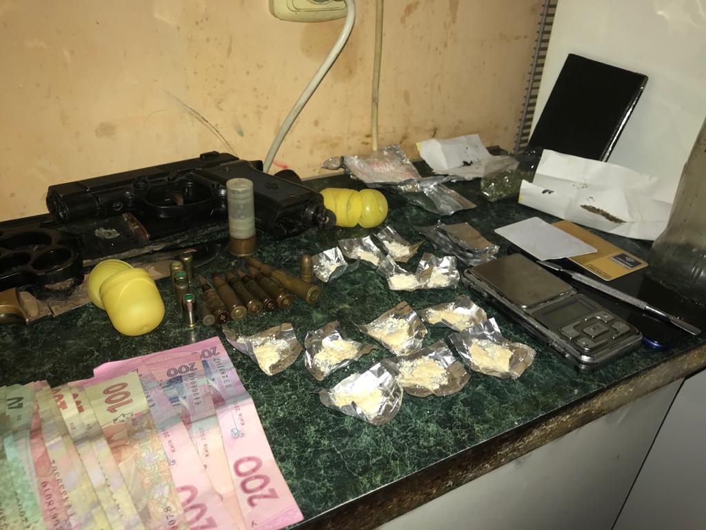 Під час обшуку за місцем проживання другого фігуранта вилучено 12 фольгових згортків із речовиною, схожою на амфетамін; предмет, схожий на пістолет; патрони; грошові кошти; електронні ваги; фольгові заготовки для фасування амфетаміну; предмет, схожий на кастет, та речовину рослинного походження, схожу на наркотичний засіб (марихуану).
