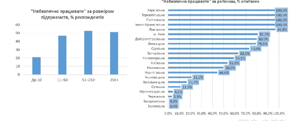 Зокрема, 100% опитаних підприємців у Харківській, Тернопільській, Полтавській та Івано-Франківській областях заявили про небезпеку для ведення бізнесу через ракетні атаки РФ. У Львівській області вважають, що небезпечно працювати, 96,8% опитаних, у Києві – 81% респондентів.