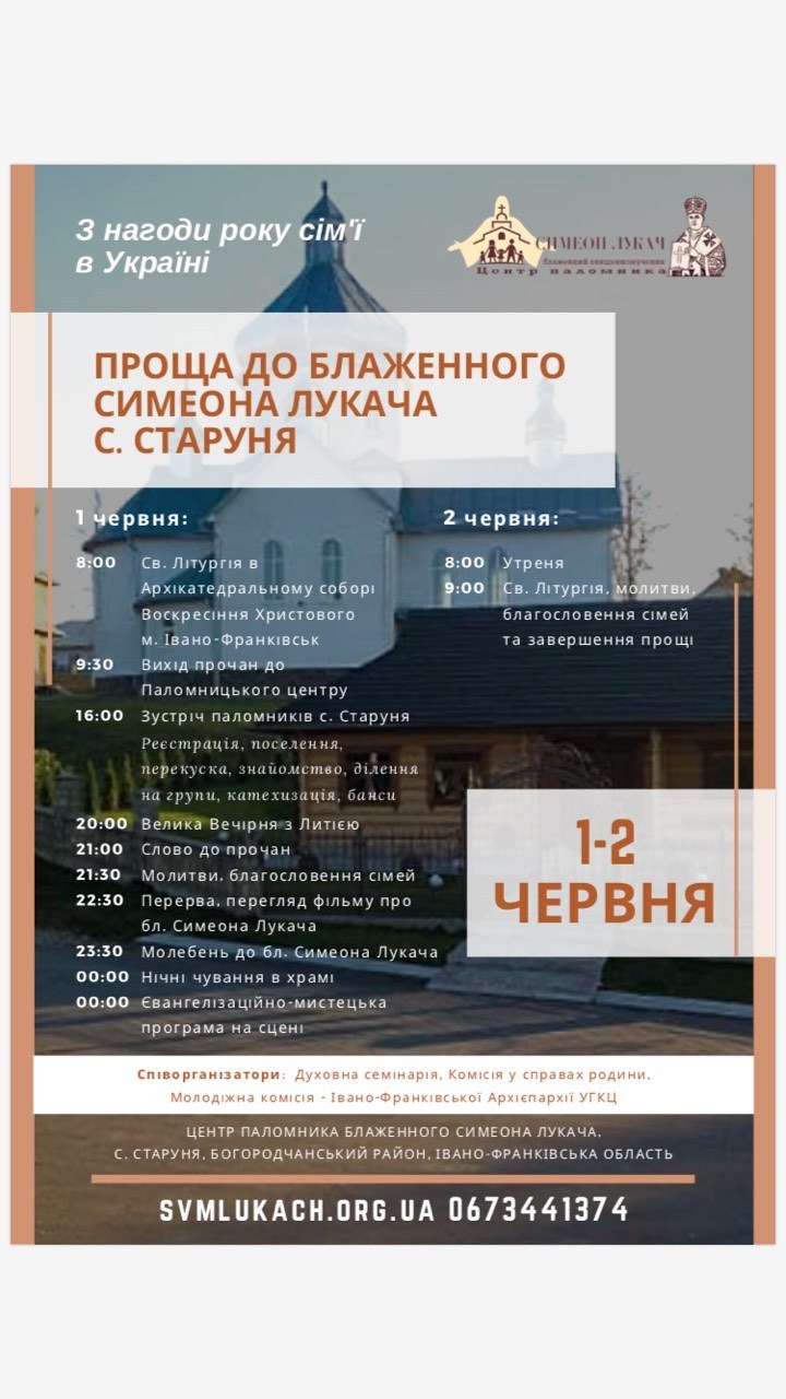 1-2 червня 2019 року відбудеться проща до паломницького центру Блаженного Симеона Лукача, с. Старуня, що на Богородчанщині. Паломництво пройде з нагоди Року сім’ї в Україні.