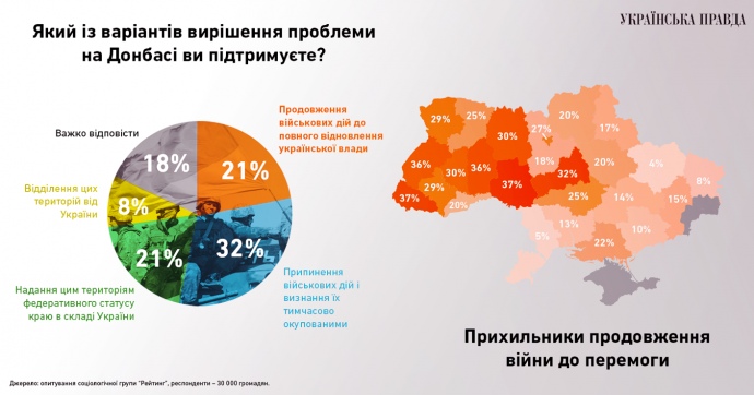 Третина жителів воліє припинити військові дії та визнати територію тимчасово окупованою, а 21% – надати їй федеративного статусу в складі України.