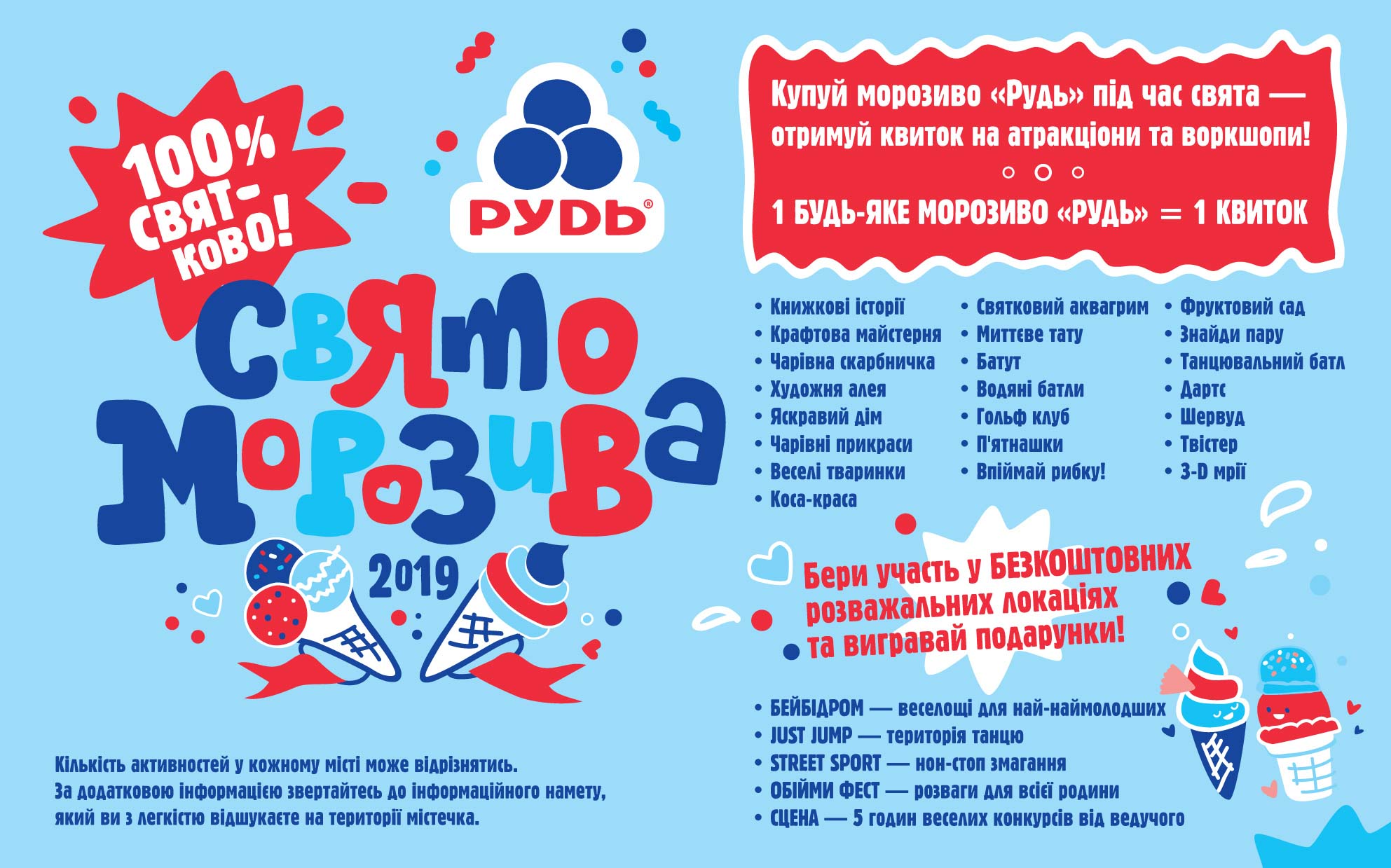 “На нашому святі є багато вільних від будь-яких умовностей локацій, куди можна прийти й розважитися на 100 %: побавитися на бейбідромі, запалити танцпол у танцювальній зоні, спробувати власні сили на зоні спортивних змагань, взяти участь у веселих конкурсах від найкрутішого ведучого! Ми робимо акцент на цінностях родини. Запрошуємо зібратися разом та прийти відпочити на Святі Морозива від компанії “Рудь” на повну!”