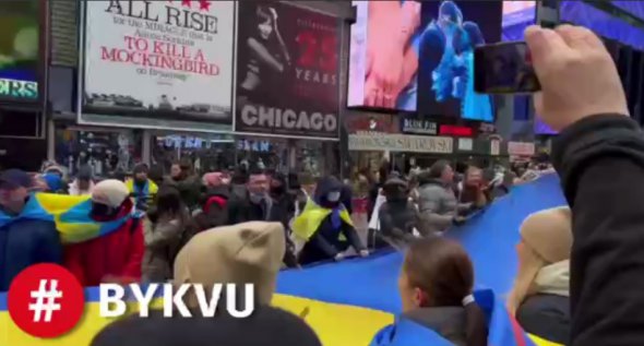 У Нью-Йорку на Таймс-Сквер громадяни розгорнули довгий синьо-жовтий стяг і скандують усім відому кричалку: “Путін ху*ло”.