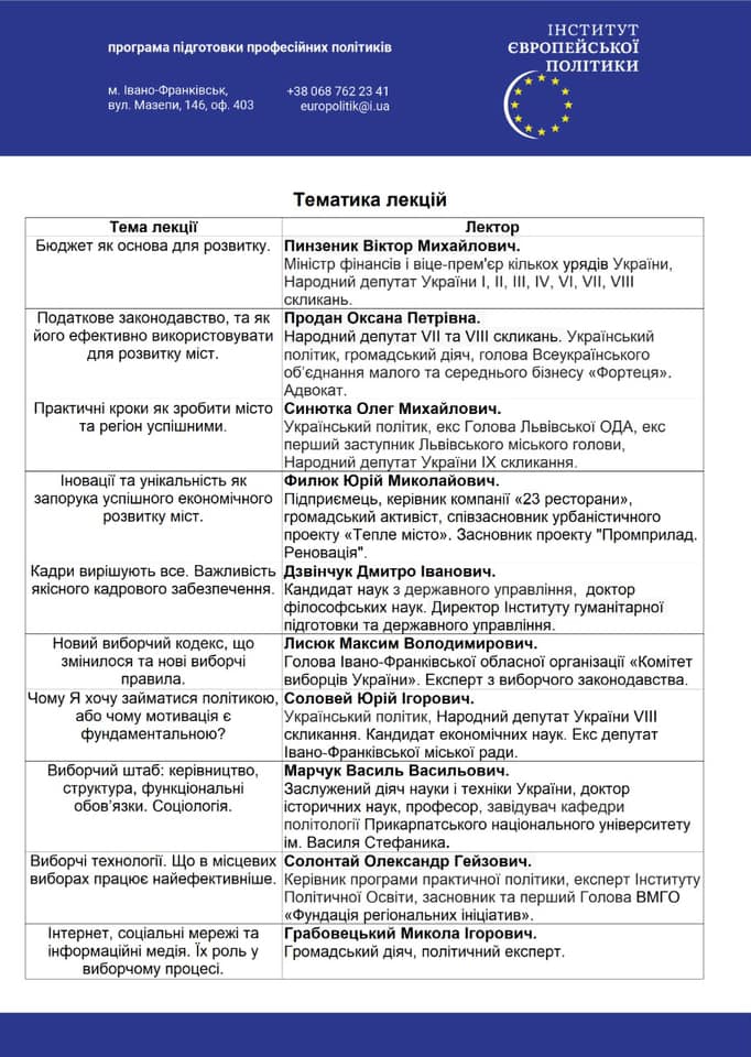 «Ця програма стосуватиметься майбутніх депутатів обласного центру Івано-Франківської міської ради. В рамках цієї програми ми не тільки поділимося з учасниками досвідом того, як успішно будувати виборчі кампанії, формувати її місію, але також навчимо, як ефективно працювати в соціальних мережах та захищати результати своїх виборів. Поряд з тим ми поділимося своїми знаннями і своїм досвідом щодо того, як ефективно розвивати свою громаду, населений пункт та регіон, який слухачі матимуть за честь представляти в своєму представницькому органі. Мені приємно анонсувати, що серед ТОП-спікерів цієї програми будуть відомі українські успішні політики, які не лише в теоретичному, але й у практичному плані реалізували дуже багато успішних проектів», – відзначив Юрій Соловей, голова ГО «Інститут європейської політики».
